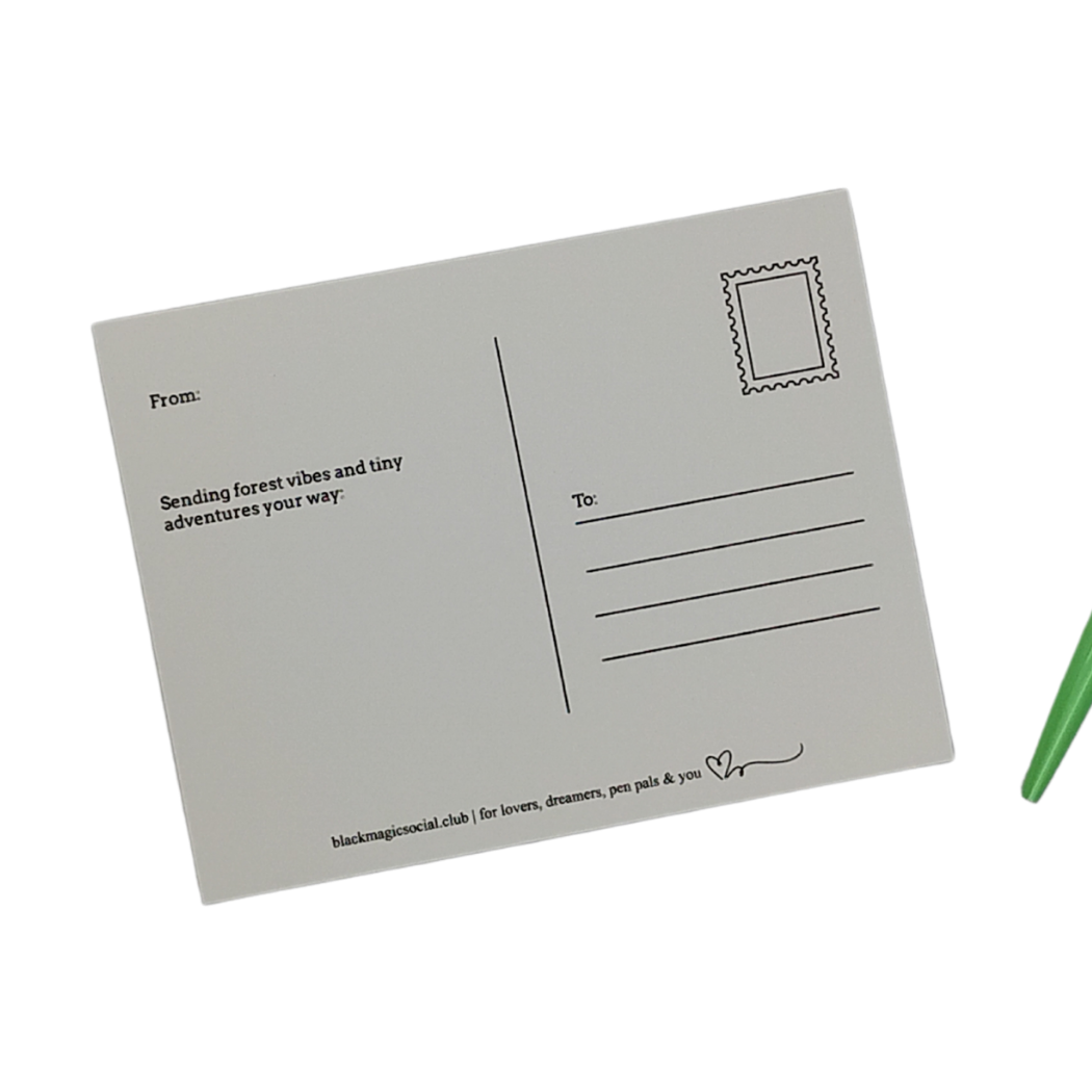 This dreamy postcard features majestic Black girls roaming an enchanted forest, an ode to Black fantasy, friendship, freedom, and the wild power of imagination. "Sending forest vibes and tiny adventures your way:"